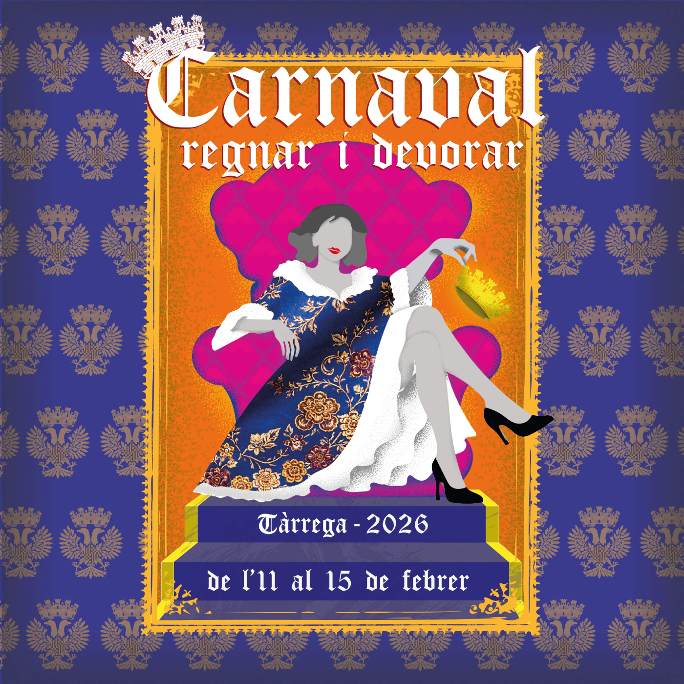 Sota el crit de “Regnar i devorar!”, Sa Majestat i la seva cort arriben disposades a fer del Carnaval un acte de poder i transgressió. El tron ja no simbolitza control, sinó l’excés; la corona no imposa normes, les trenca. Tàrrega es transforma així en un regne sense lleis ni jerarquies, on governar vol dir ballar, perdre’s i deixar-se portar fins que el cos i la nit diguin prou.