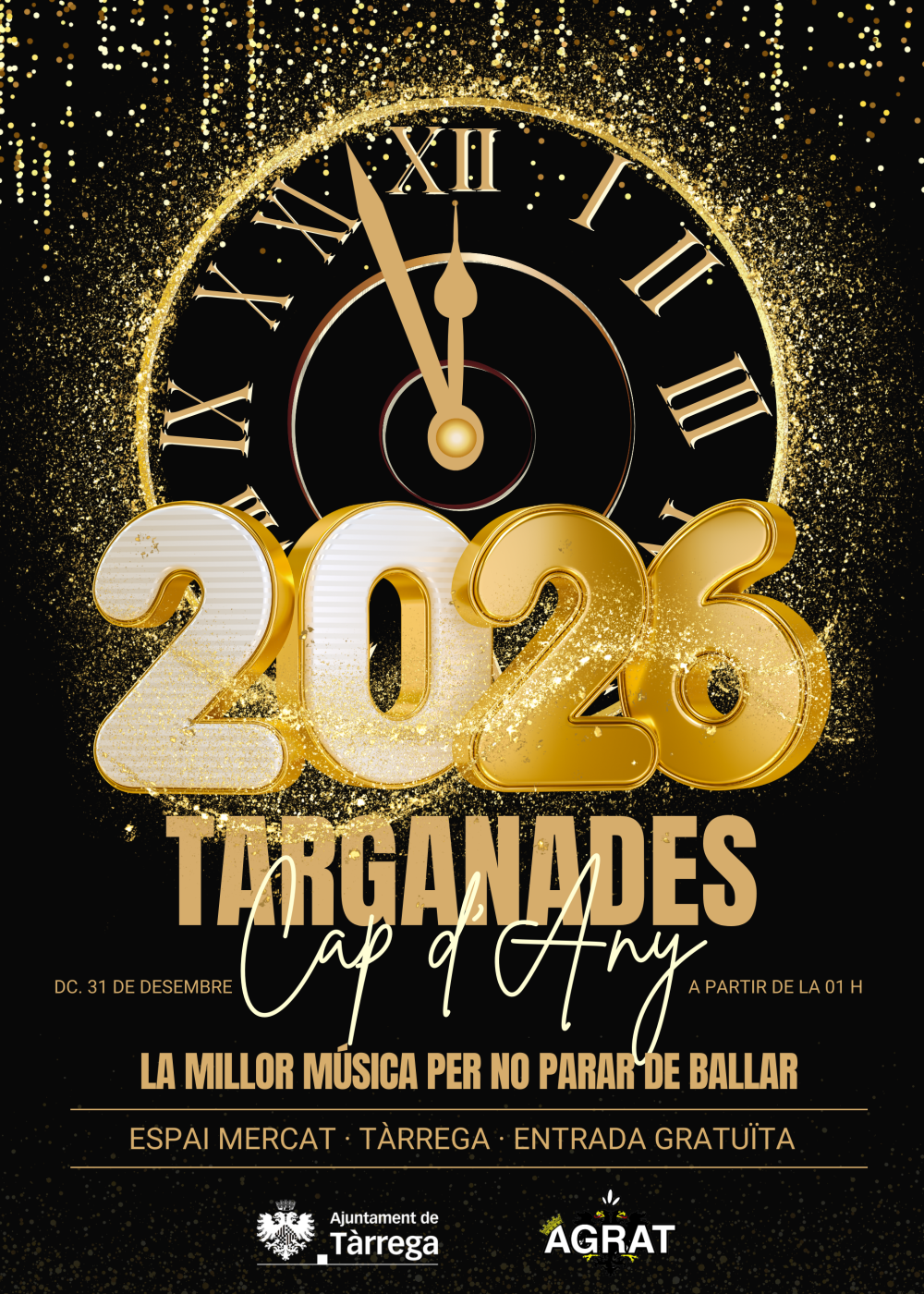 L’Associació Agrat uneix forces amb la Regidoria de Cultura per oferir una festa de comiat de l’any 2025 i donar la benvinguda al nou any 2026 amb les TARGANADES, gran festa que inclou les campanades a les 3 de la matinada. La millor música amb èxits actuals a l'Espai MerCAT. També amb esmorzar popular en sortir el sol. A la 1 s’obriran les portes de l’Espai MerCAT per donar la benvinguda al nou any amb una sessió musical per no parar de ballar.