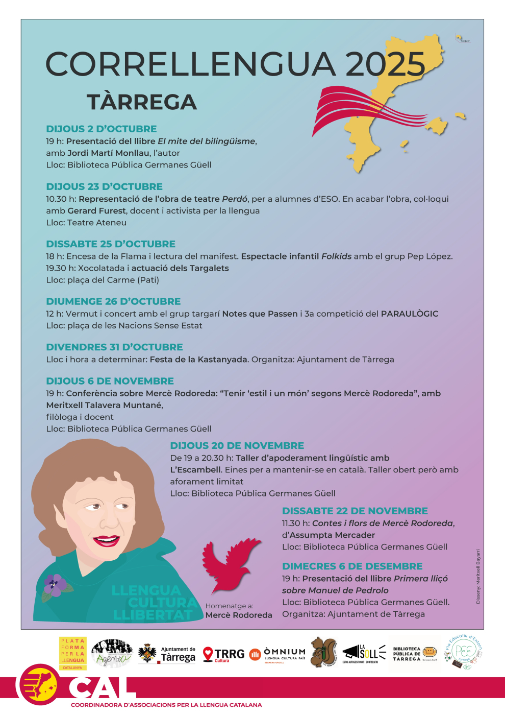 El municipi de Tàrrega se suma, un any més, a la celebració del Correllengua 2025, un esdeveniment que reivindica l'ús social del català a través d'activitats culturals i festives. Amb un programa d’activitats fins al 22 de novembre, hi haurà xerrades, presentacions de llibres, teatre, tallers, concerts i la festa de la Castanyada.